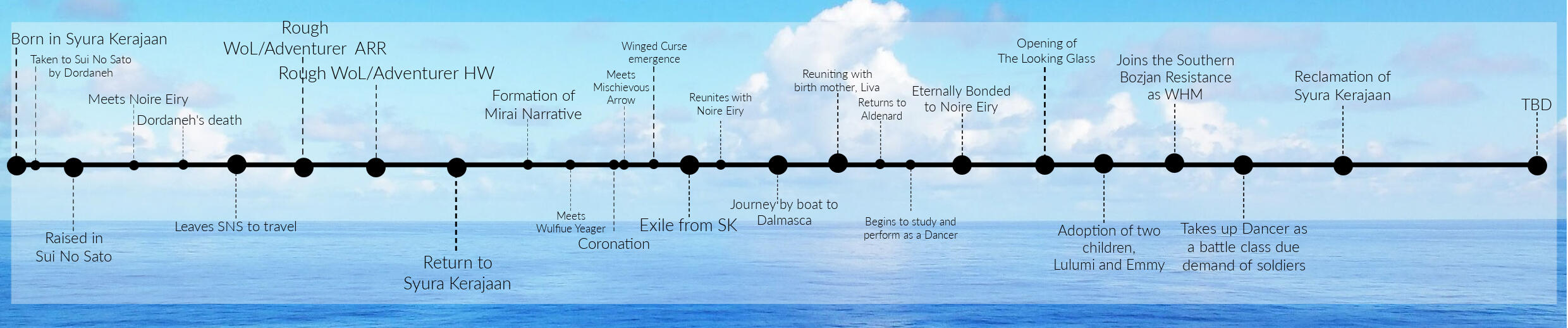 Munira was conceived by Liva, her Veena birth mother, who was a concubine to the King of Syura Kerajaan, Yul. The pregnancy was hastily hidden until Liva was able to give birth. The infant Munira was whisked away from the Kingdom in the middle of the night by Dordaneh, a Raen woman hailing from Sui No Sato - Liva’s confidant and lover.Before their leave, Liva, a skilled black mage, cast a black magick glamour onto Munira to disguise her as a Raen.Although Sui no Sato typically does not welcome those who once left back, because Dordaneh was born there and her parents still resided, they permitted her and her "daughter's" return. While there Munira lived with Dordaneh, and Dordaneh’s sheltered Mother and Father. Dordaneh was subject to scorn from most of the residents of the village for having a child of wedlock, especially having the father remain unknown. Though they were never inherently cruel, Munira’s grandparents were hesitant to nurture the child, sensing something was amiss.The song All Is Found is part of the Raen glamour incantation. Dordaneh was instructed by Liva to sing it to Munira often, every night if possible, to retain the black magicks.Munira was made to believe Dordaneh was her biological mother. She lived in Sui No Sato through her childhood, even for a short time after her mother’s death.The Viera discovered her true form following the death of her mother. The mental trauma counter acted with the magick's aether and she was discovered as a young Veena by the Blue Kojin tribe. The Kojin tribes most skilled black mage was able to mimic the glamour incantation for her to return to Sui No Sato, but not knowing the secrets of the spell nor the necessary repeated incantation (All Is Found) the glamour began to noticeably fade.Munira’s scales and hair would glow a rainbow holographic hue, and on the worst days her height would change sporadically – growing and shrinking a foot within the span of a week. She was already an outsider in Sui No Sato, and taking this into consideration with the short amount of time she knew she had left of her disguise she decided it best to leave. The Echo had provided her with visions of Syura Kerajaan, and she set out on a journey to find her lineage - in hopes to find somewhere she belonged.After traveling Eorzea Munira arrived at Syura Kerajaan in turmoil. The king, her biological father, had just passed. Her arrival seemed all too coincidental to his death, and only after she was heavily questioned, aether read by the few of the kingdom’s Oracle, and met with many of the high born and parliament members she was proven to be truly the child of the late king.It was upon her return to the kingdom that Munira began to suffer symptoms of the Winged People Curse.After some time, it was decided by both Munira and parliament that she would return to Eorzea, insisting she needed experience in ruling/leading before she could take the throne. Once back in Eorzea she formed the Free Company Mirai Narrative. She recruited members and ran the company as the lead, hoping to prove herself to herself and so many others that she is capable of doing so.A few Astral Sun and Moons passed before she returned to Syrun Kerajaan. Munira was crowned as Queen, but only ruled for a short amount of time. Rumors began to spread within the parliament of her intentions as ruler. Once it was outed that Munira was a Viera in disguise and harbored the curse of the Winged People, Parliament took action and proceeded with exile. Through a violent and traumatic physical battle Munira and her chocobo Blossom fought until ultimately banished from the place she fought so desperately to protect, lead, and she thought she could finally call home.Munira returned to Eorzea and considered trying to return to Sui No Sato despite all her black magicks faded. It’s by chance meeting in the Ruby Sea that her only childhood friend, Noire Eiry, finds her and tells her about the new discovery of The First. He informs her there is talk of an entire Viera colony, and in hopes of finding where she belongs, Munira heads out on a journey to find The Wood. This is the first journey she doesn’t take alone, as Noire insists on accompanying her – worried for his dear friend after she has so recently been through so much.(Further information on timeline)
